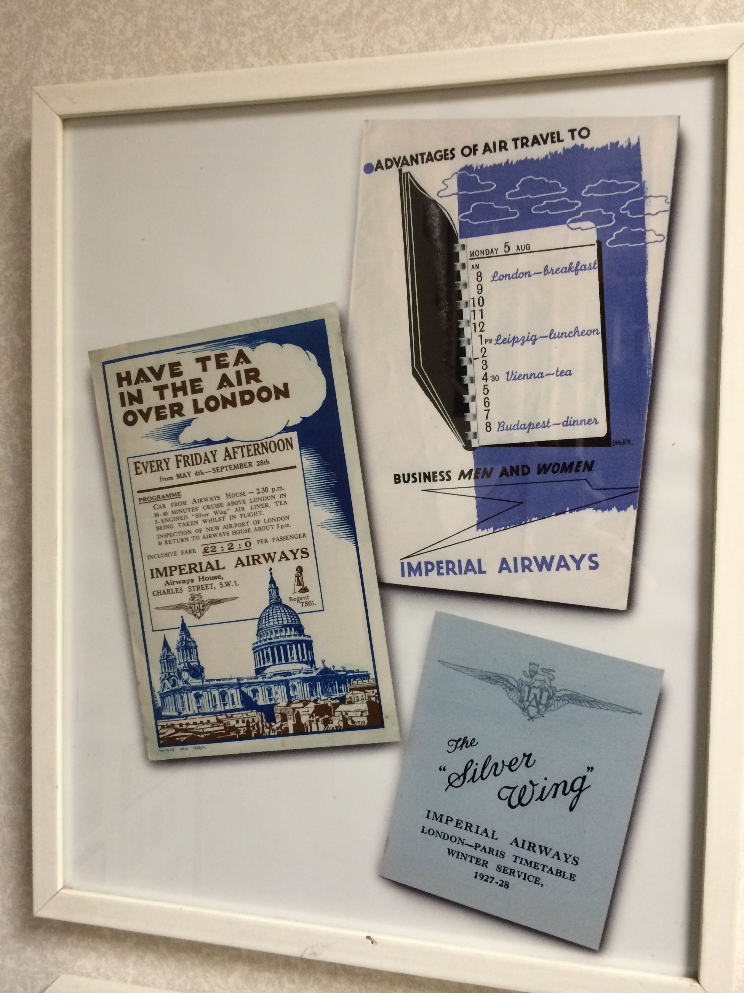 Some of this promotional material is particularly fascinating, including a poster encouraging people to take a 30 to 40 minute Imperial Airways flight and “have tea in the air over London.” Passengers would be picked up in a car from the airline’s offices in SW1 at 2:30pm and be returned at about 5pm. The flight ran every Friday during the summer months. And the chance to have an “inspection of new air-port of London” was also promoted as one of the benefits of going on the trip.