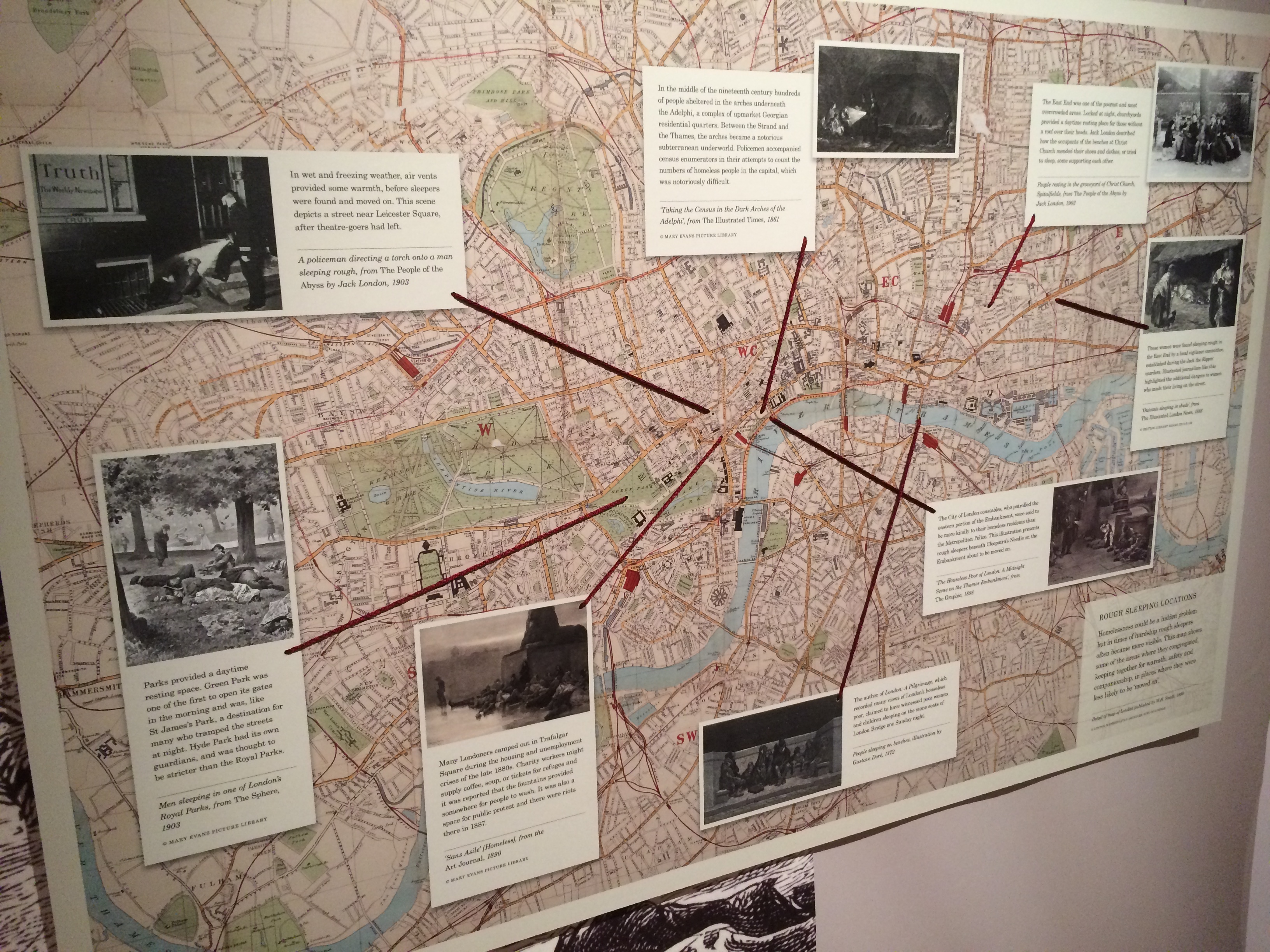 Sadly, however, homelessness in Britain hasn’t been eradicated. Just as early on in the exhibition there is a map plotting the popular places where those without a place to lay their heads spent their time, outside the main gallery this exercise has been repeated. Contemporary interviews reveal that it is still parks, along with other places like railway stations that some destitute Londoners today call home.
